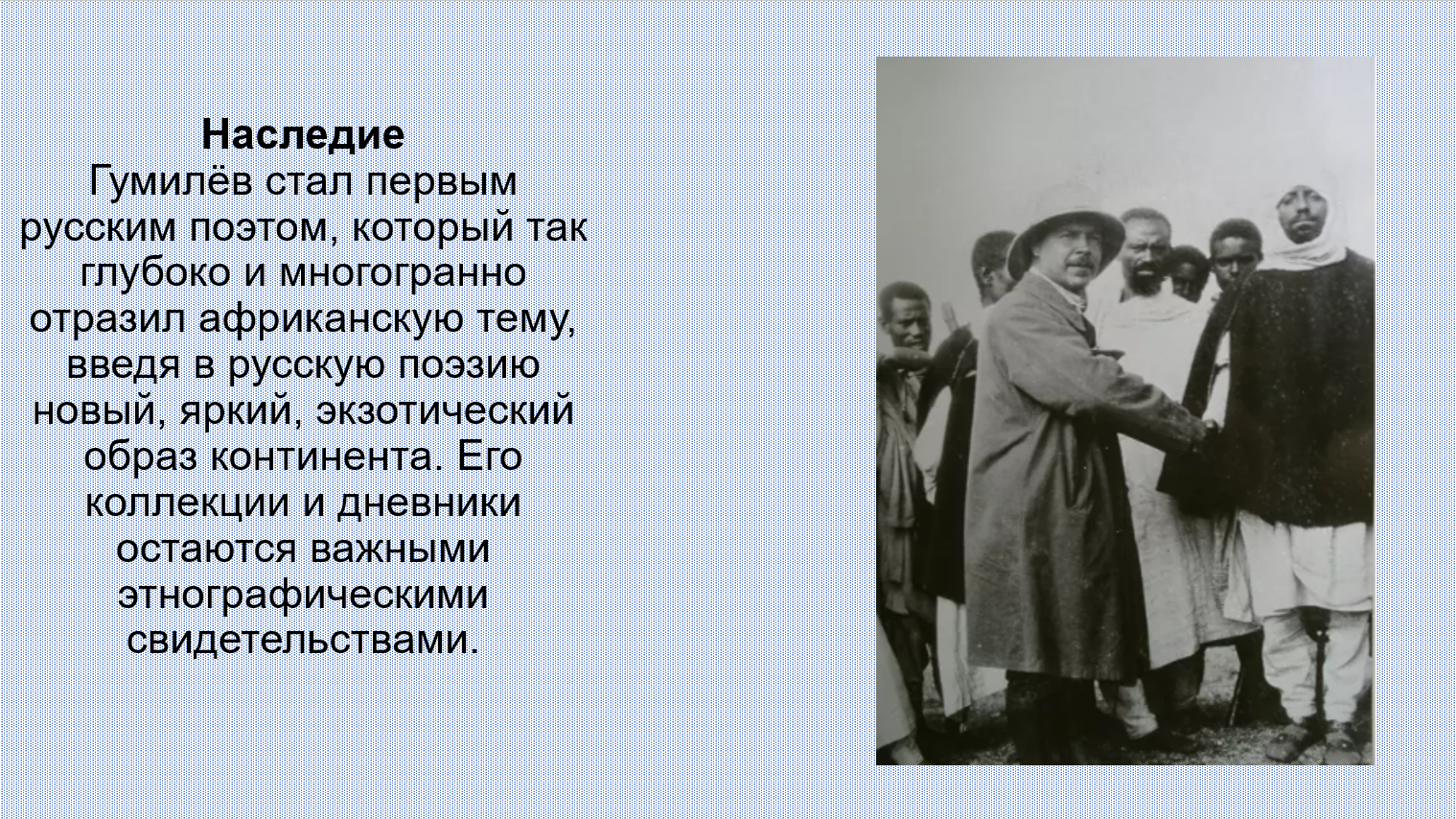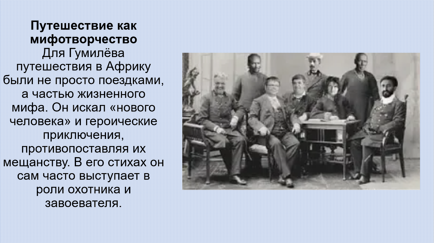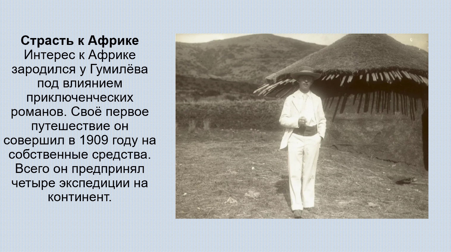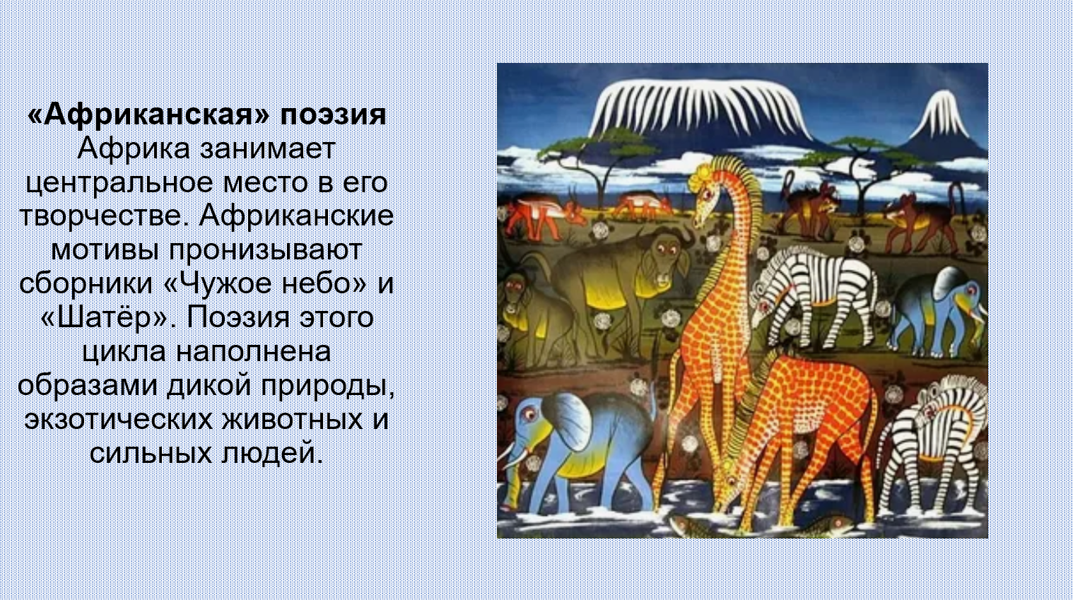 Добавить текст Вернуть оригинал6. В числе первых исследователей Африки среди российских учёных был русский поэт Н. Гумилёв. Подготовьте презентацию по его произведениям на тему «О тебе, моя Африка...», посвящённую путешествиям по Африканскому континенту.