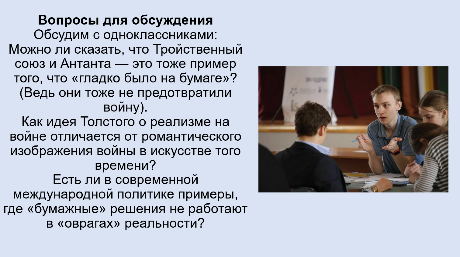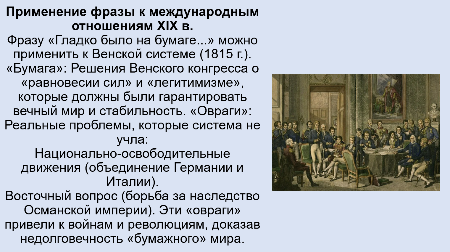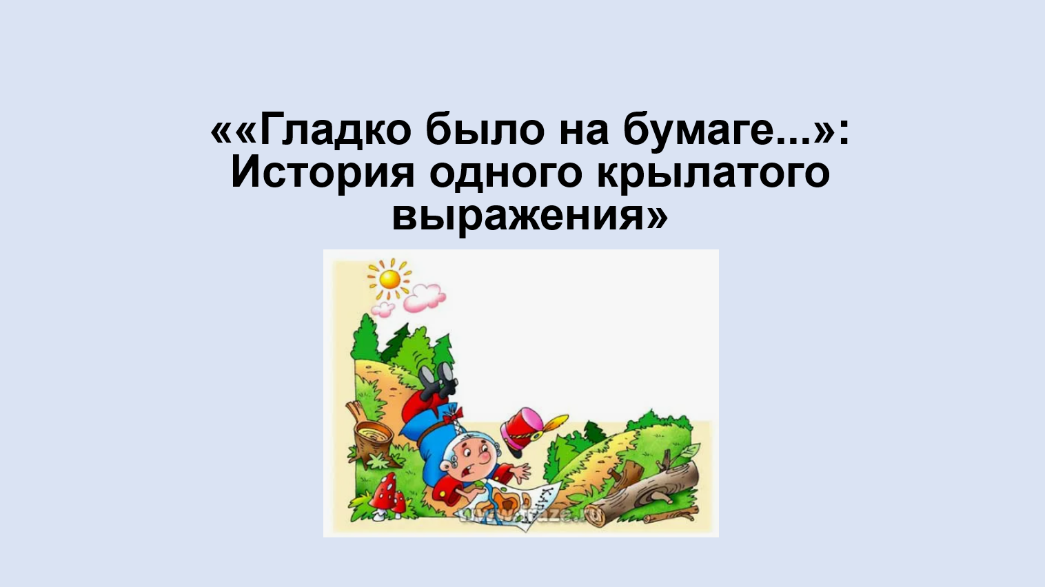 Добавить текст Вернуть оригинал5. Прочитайте крылатое выражение: «Гладко было на бумаге, да забыли про овраги, а по ним ходить». С помощью дополнительных источников информации, узнайте подлинную фразу, определите её автора и событие, с описанием которого она связана. Как судьба автора строк связана с одним из изложенных в параграфе исторических событий? Результат оформите в виде презентации. Обсудите ее с одноклассниками.
