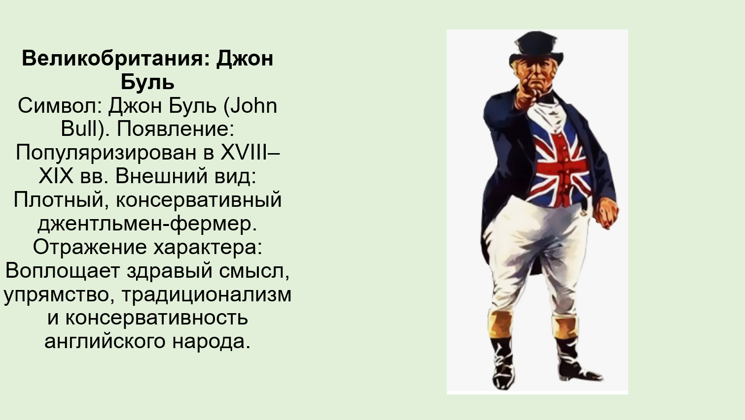 Добавить текст Вернуть оригиналНациональный характер: Воплощает консерватизм, здравый смысл, упрямство и традиции английского народа.
