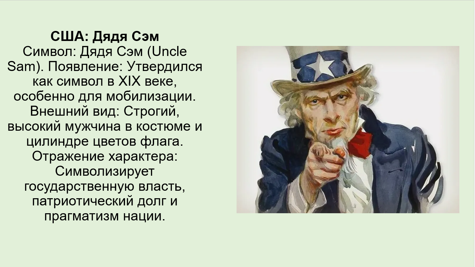 Добавить текст Вернуть оригиналНациональный характер: Воплощает государственность, патриотический долг (использовался для призыва в армию), предпринимательскую хватку и прагматизм.