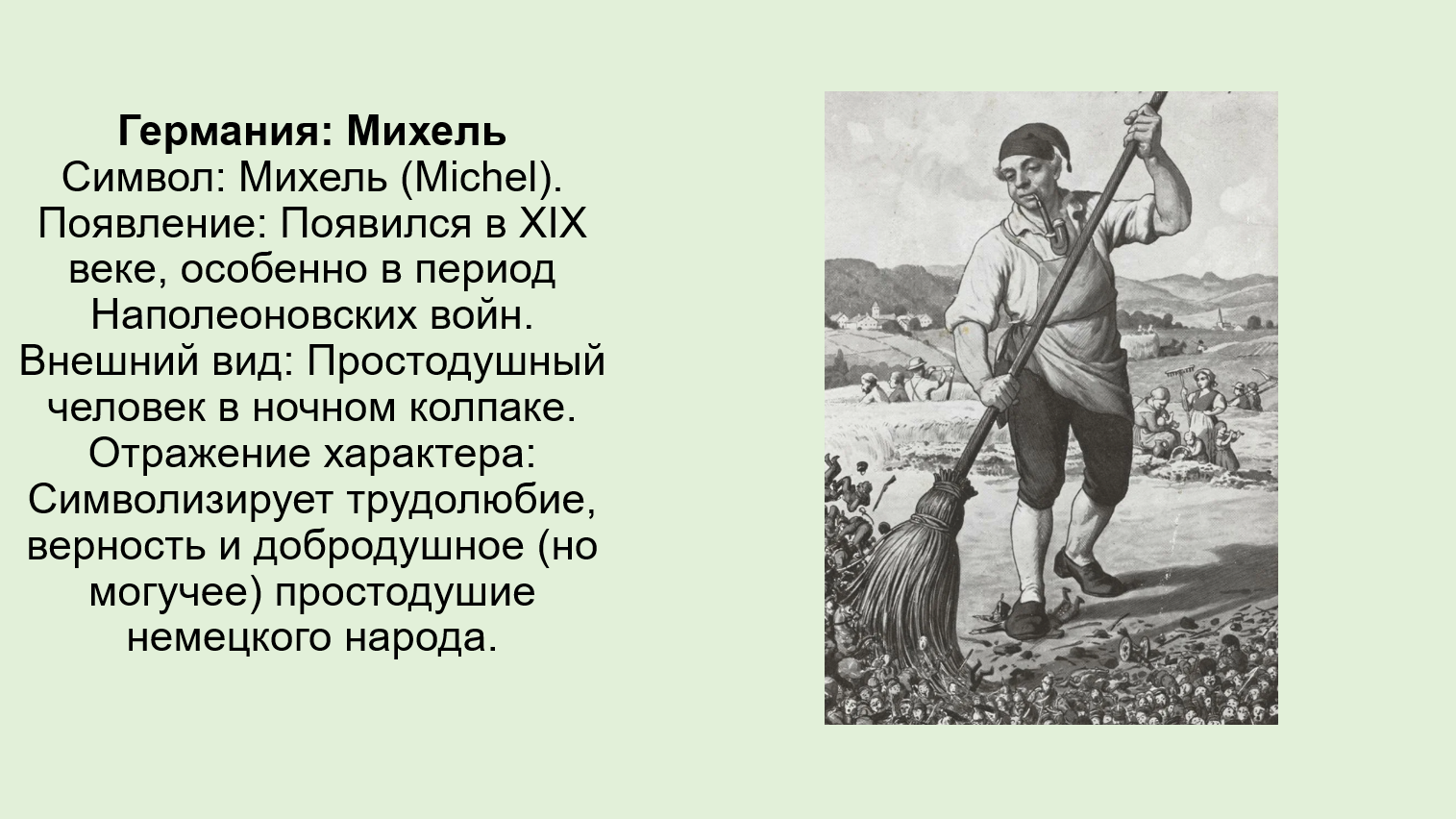 Добавить текст Вернуть оригиналНациональный характер: Воплощает простодушие, трудолюбие и верность нации (после объединения Германии).
