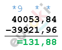 \[3)\ 40\ 053,84 - 39\ 921,96 =\]