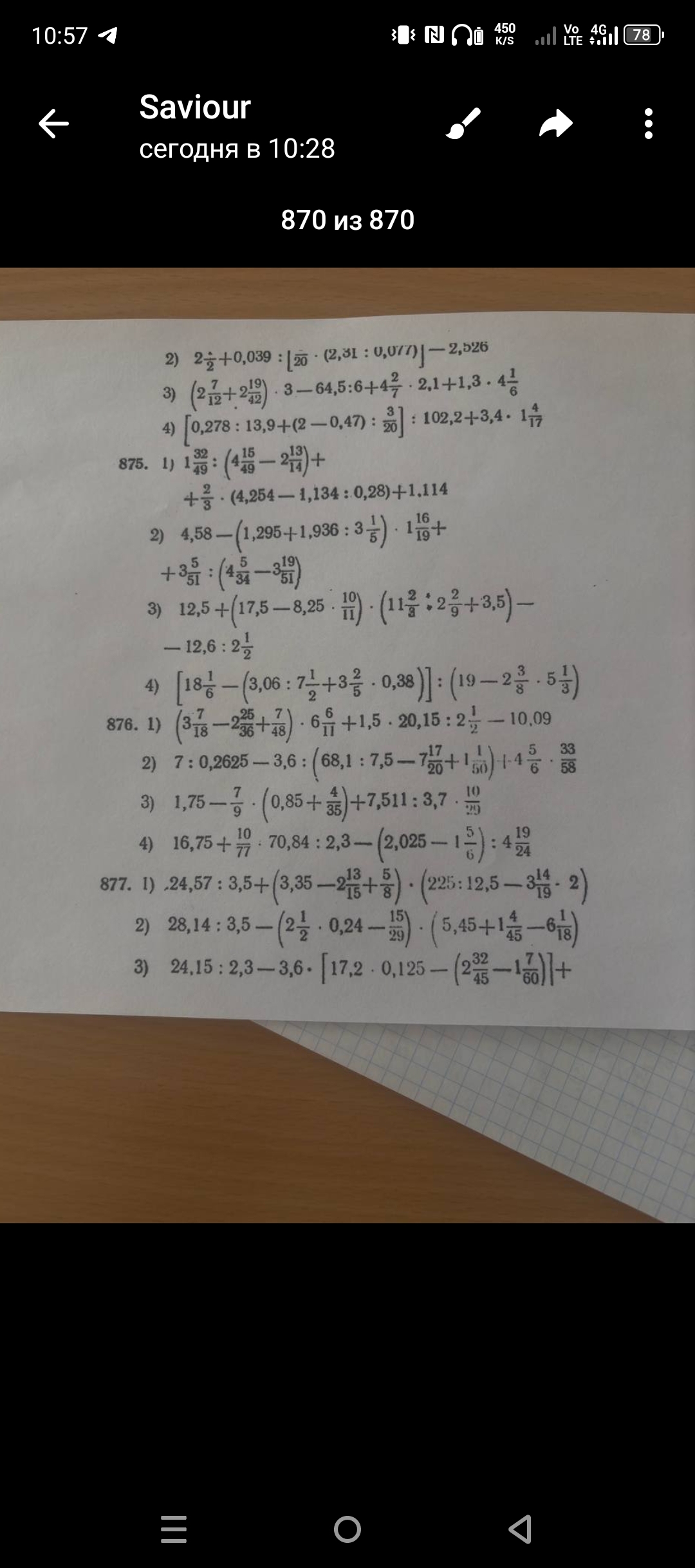 877. 2) $28,14:3,5-(2\frac{1}{2}\cdot0,24-\frac{15}{29})\cdot(5,45+1\frac{4}{45}-6\frac{1}{18})$