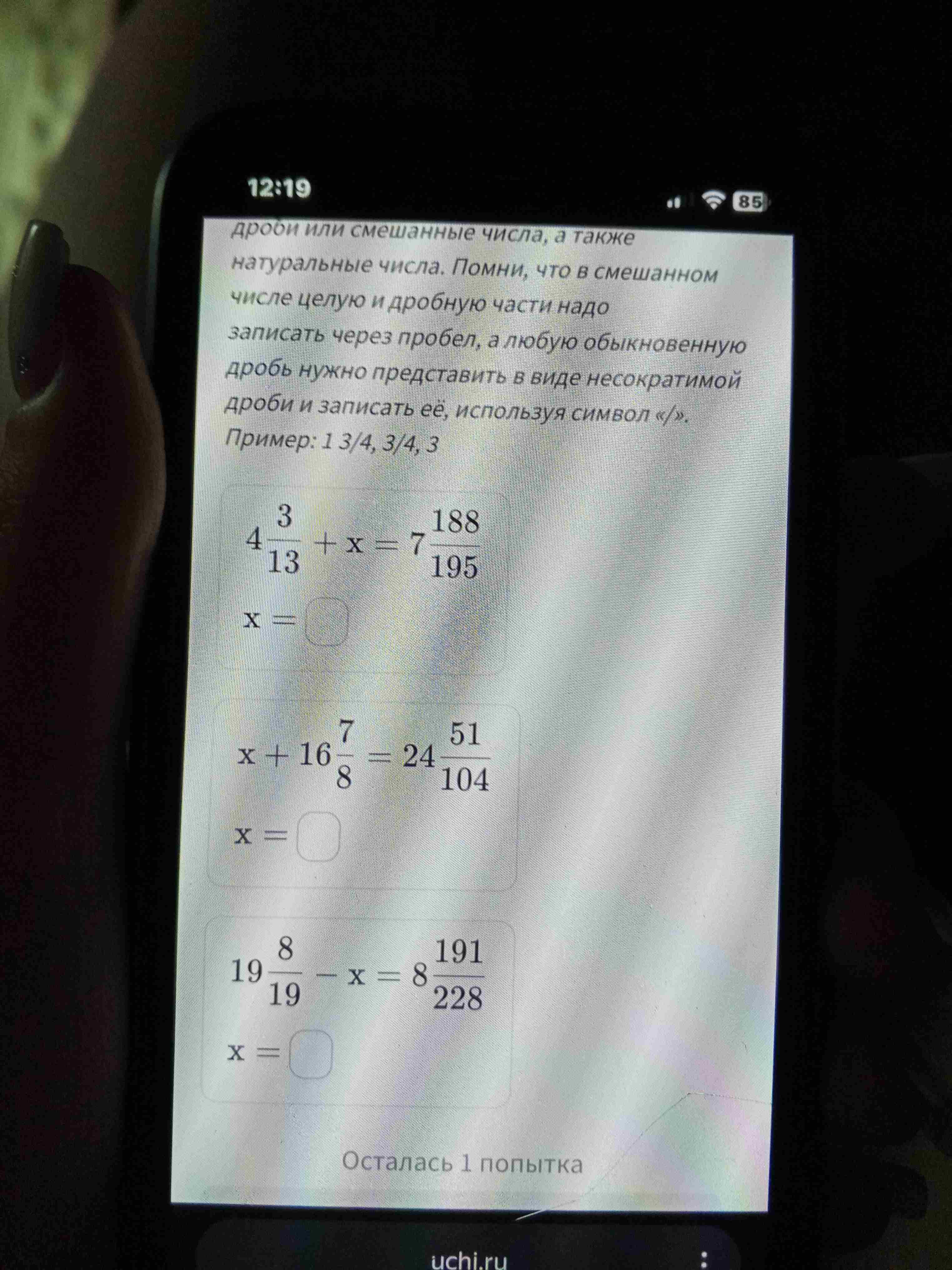 Решим уравнение: $$4\frac{3}{13} + x = 7\frac{188}{195}$$