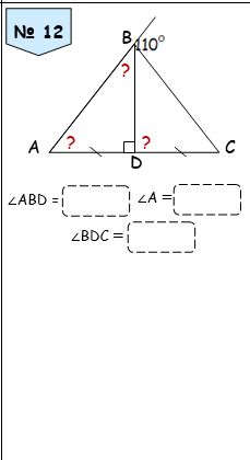 $$∠A = ∠C = \frac{180° - 70°}{2} = \frac{110°}{2} = 55°$$BD - высота, значит, треугольник ABD - прямоугольный, ∠ADB = 90°.