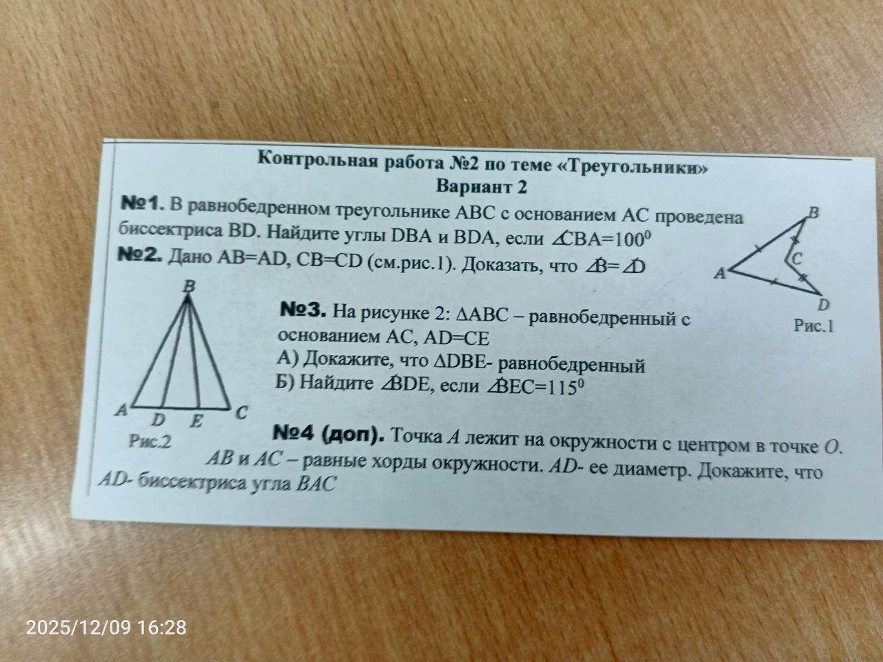 №4 (доп). Точка А лежит на окружности с центром в точке О. АВ и АС – равные хорды окружности. AD- ее диаметр. Докажите, что AD- биссектриса угла ВАС