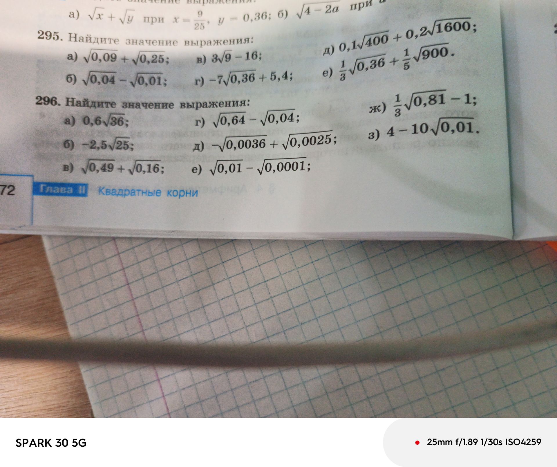 а) \(\sqrt{x} + \sqrt{y}\) при \(x = \frac{9}{25}\), \(y = 0,36\).