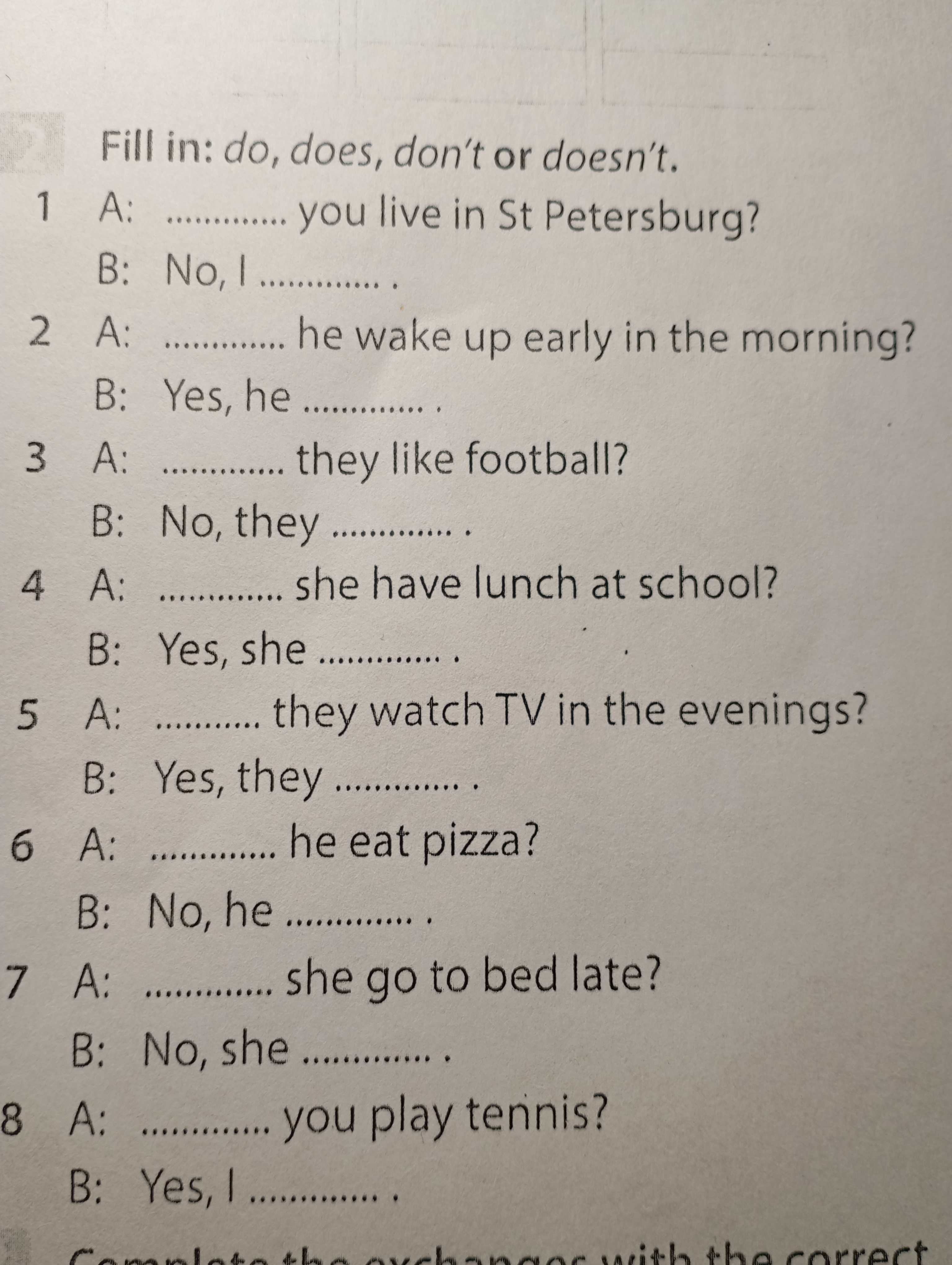 Fill in: do, does, don't or doesn't. 1 A: ......... you live in St Petersburg? B: No, I ........