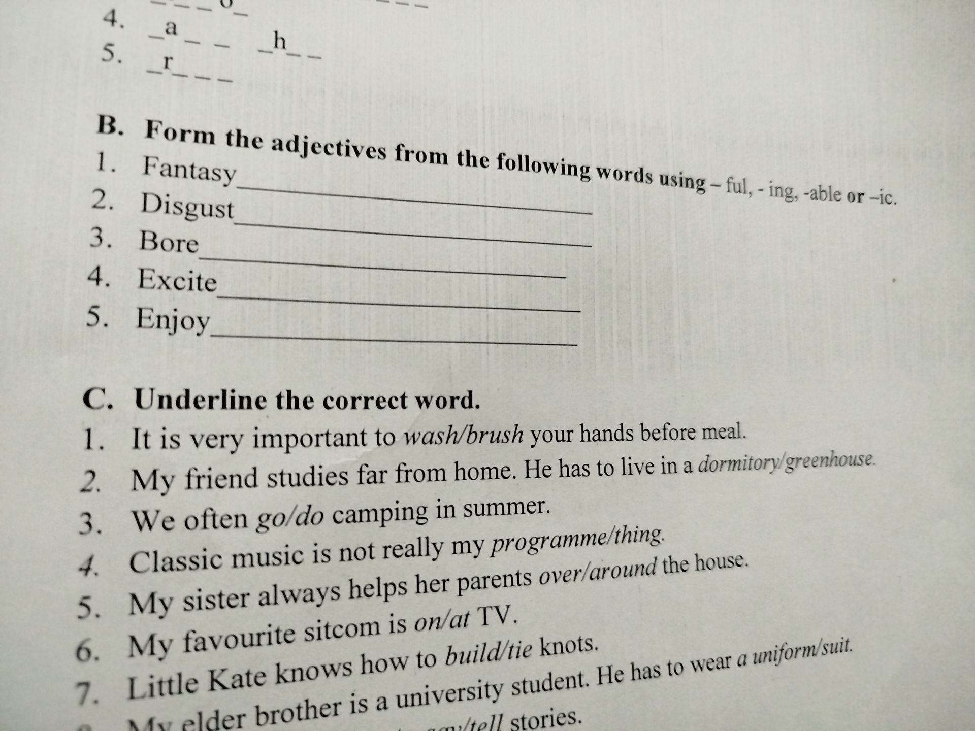 B. Form the adjectives from the following words using - ful, - ing, -able or -ic. 1. Fantasy