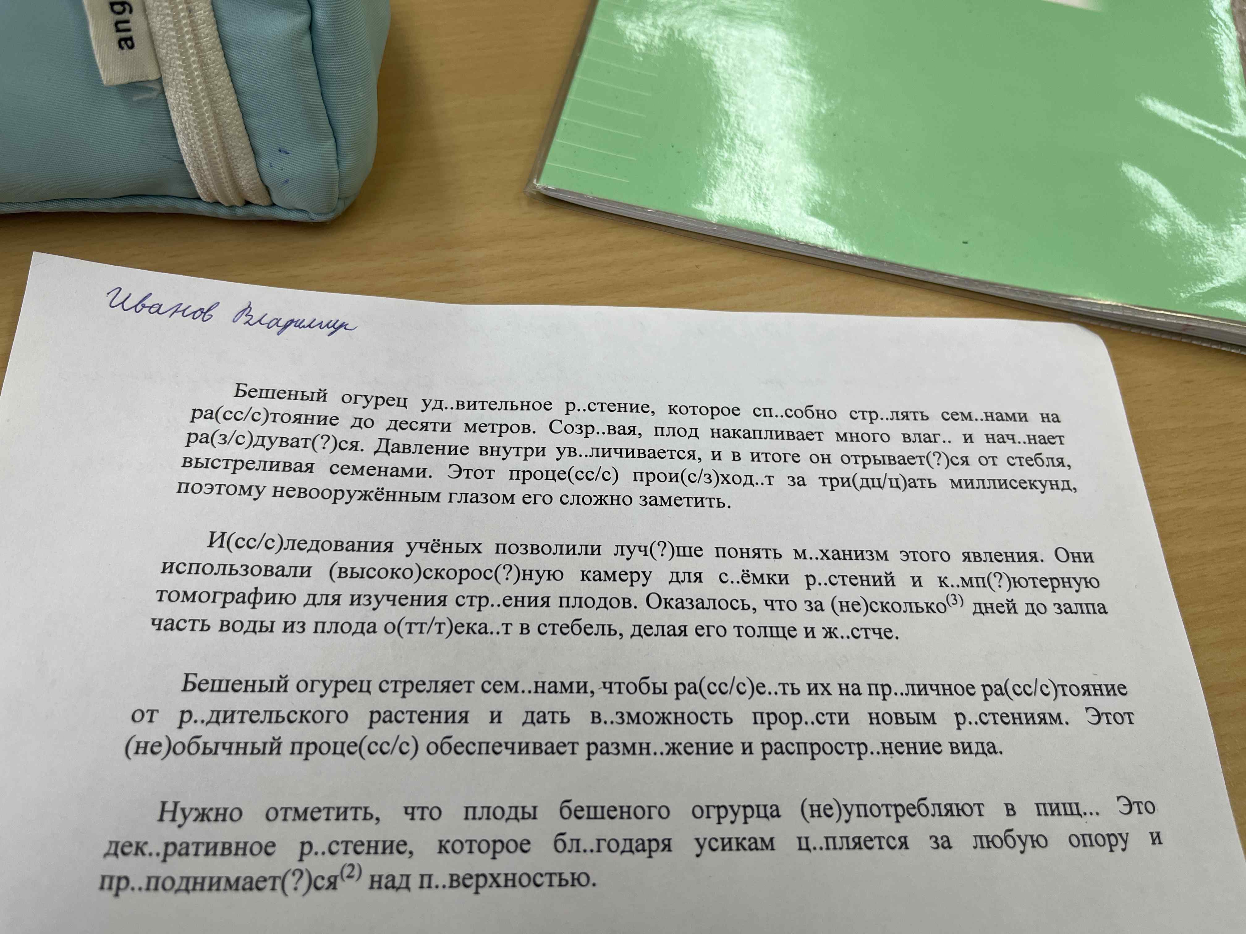Бешеный огурец уд..вительное р..стение, которое сп..собно стр..лять сем..нами на ра(сс/с)тояние до десяти метров. Созр..вая, плод накапливает много влаг.. и нач..нает ра(з/с)дуват(?)ся. Давление внутри ув..личивается, и в итоге он отрывает(?)ся от стебля, выстреливая семенами. Этот проце(сс/с) прои(с/з) ход..т за три(дц/ц)ать миллисекунд, поэтому невооружённым глазом его сложно заметить. И(сс/с)ледования учёных позволили луч(?)ше понять м..ханизм этого явления. Они использовали (высоко) скорос(?)ную камеру для с..ёмки р..стений и к..мп(?)ютерную томографию для изучения стр..ения плодов. Оказалось, что за (не)сколько (3) дней до залпа часть воды из плода о(тт/т)ека..т в стебель, делая его толще и ж..стче. Бешеный огурец стреляет сем..нами, чтобы ра(сс/с)е..ть их на пр..личное ра(сс/с)тояние от р..дительского растения и дать в..зможность прор..сти новым р..стениям. Этот (не)обычный проце(сс/с) обеспечивает размн..жение и распростр..нение вида. Нужно отметить, что плоды бешеного огурца (не)употребляют в пищ... Это дек..ративное р..стение, которое бл..годаря усикам ц..пляется за любую опору и пр.. поднимает(?)ся (2) над п..верхностью.