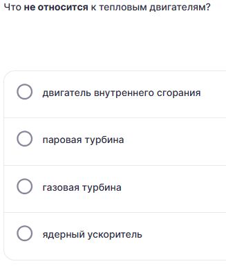 Тепловой двигатель — это двигатель, в котором тепловая энергия преобразуется в механическую работу. К тепловым двигателям относятся двигатели внутреннего сгорания, паровые турбины и газовые турбины. Ядерный ускоритель не является тепловым двигателем.