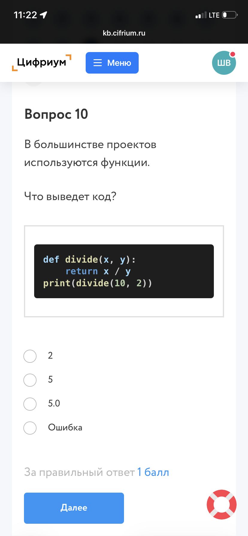 Правильный ответ: Ошибка, так как при выполнении функции divide не происходит вывод значения. Для вывода результата необходимо использовать print внутри функции или присвоить результат деления переменной, а затем вывести её.