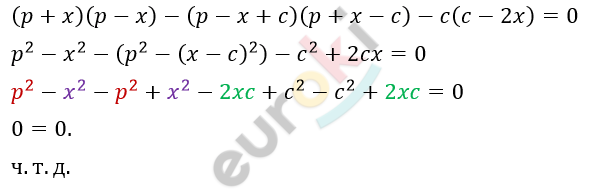Докажите, что верно равенство (p+x)(p-x)-(p-x+c)(p+x-c)-c(c-2x)=0.