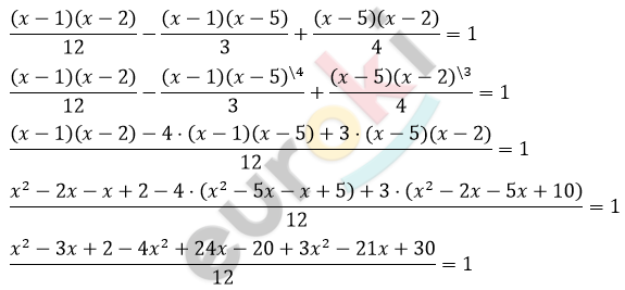 Докажите тождество ((x-1)(x-2))/12-((x-1)(x-5))/3+((x-5)(x-2))/4=1.
