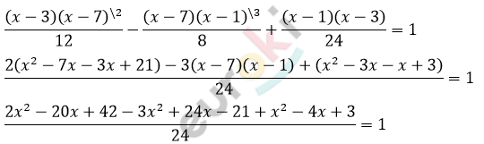 Докажите тождество ((x-3)(x-7))/12-((x-7)(x-1))/8+((x-1)(x-3))/24=1.