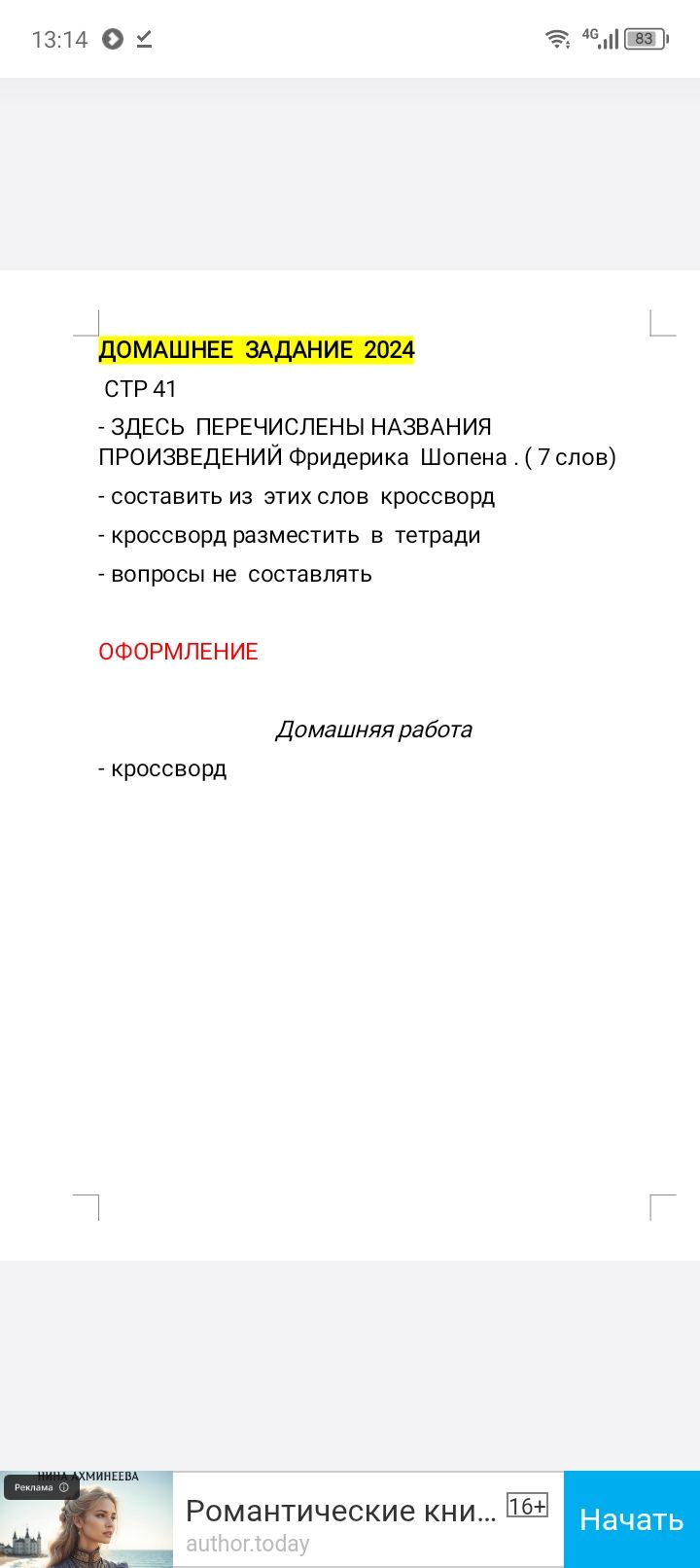 Для выполнения домашнего задания, необходимо составить кроссворд, используя названия произведений Фридерика Шопена, состоящие из 7 слов. Вопросы к кроссворду составлять не нужно. Кроссворд разместить в тетради.