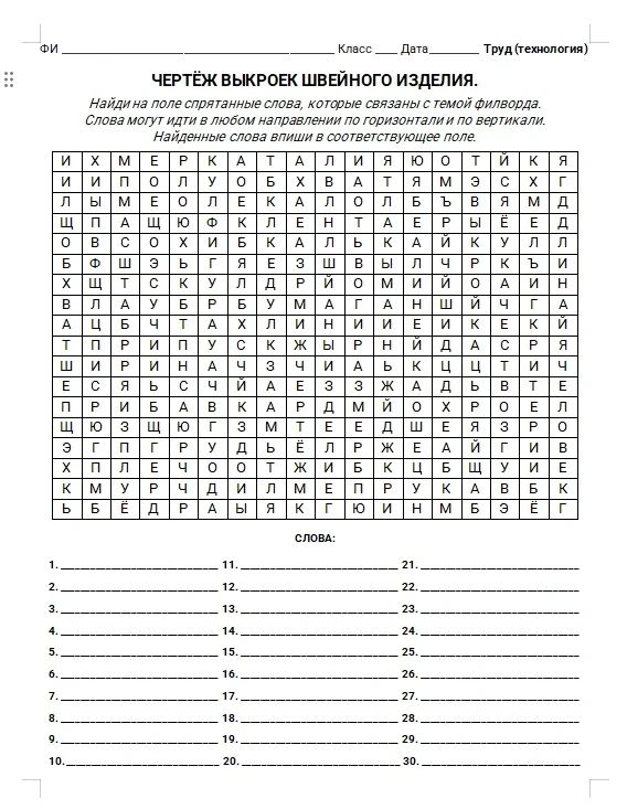 На основе представленного поля с буквами и списка слов, связанных с темой филворда, необходимо найти и вписать слова в соответствующие поля.