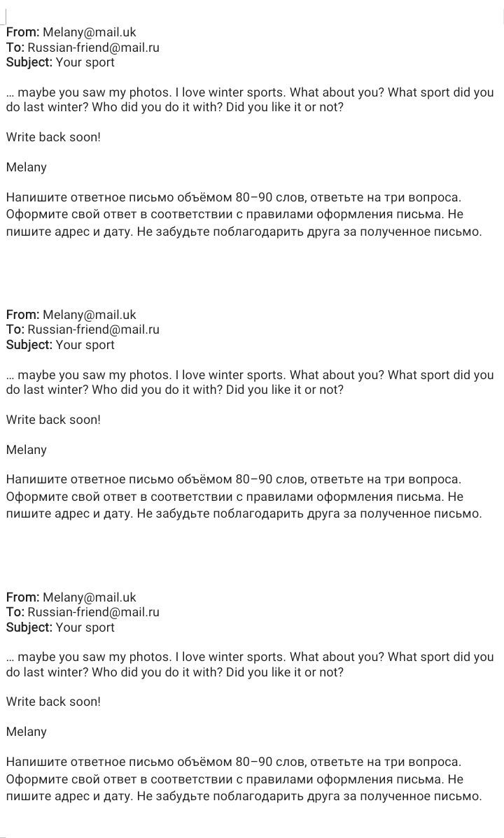 Спасибо за письмо! Я тоже люблю зимние виды спорта. Зимой я часто катаюсь на коньках и играю в хоккей. В прошлом году я с друзьями ходил в поход на лыжах. Мне очень понравилось, было весело и интересно.