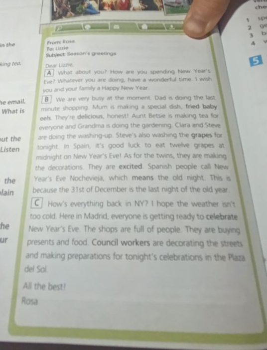- We are very busy at the moment. Dad is doing the last minute shopping. Mum is making a special dish, fried baby eels. They're delicious, honest! Aunt Betsie is making tea for everyone and Grandma is doing the gardening. Clara and Steve are doing the washing-up. Steve's also washing the grapes for tonight. In Spain, it's good luck to eat twelve grapes at midnight on New Year's Eve! As for the twins, they are making the decorations. They are excited. Spanish people call New Year's Eve Nochevieja, which means the old night. This is because the 31st of December is the last night of the old year.