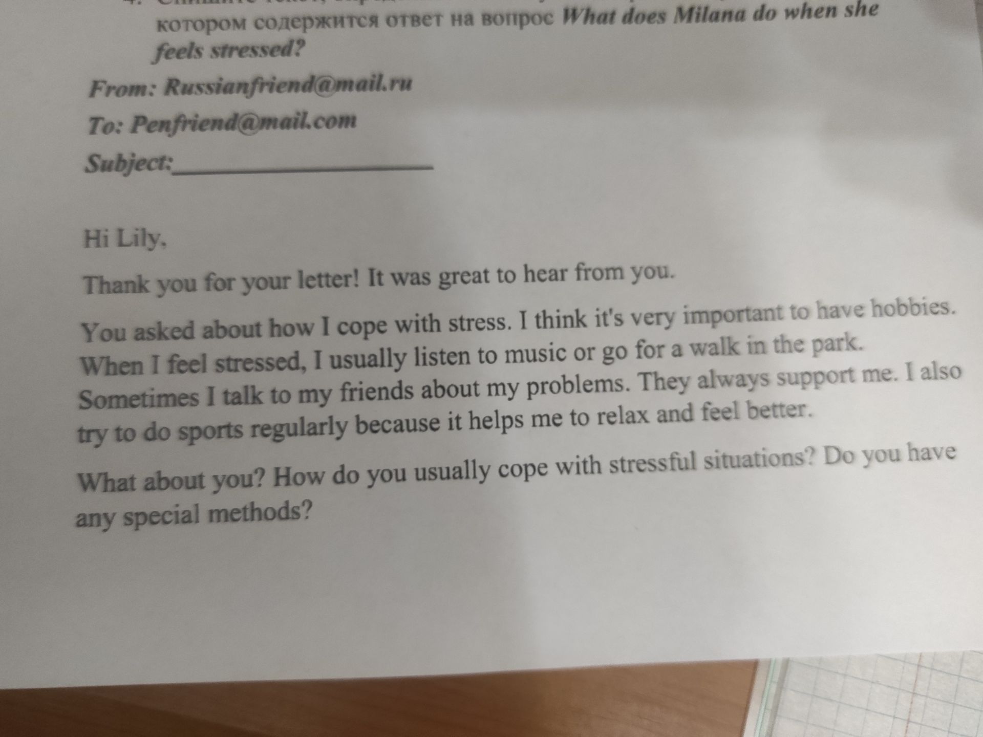 Я прочитала письмо от Russianfriend@mail.ru к Penfriend@mail.com. В письме Russianfriend благодарит Lily за письмо и рассказывает, как справляется со стрессом. Она слушает музыку, гуляет в парке, разговаривает с друзьями и занимается спортом. В конце письма Russianfriend спрашивает Lily, как она справляется со стрессом.
