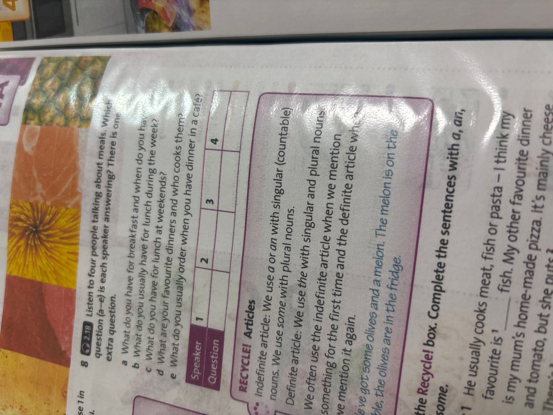 He usually cooks meat, fish or pasta – I think my favourite is 1 the fish. My other favourite dinner is my mum's home-made pizza. It's mainly cheese