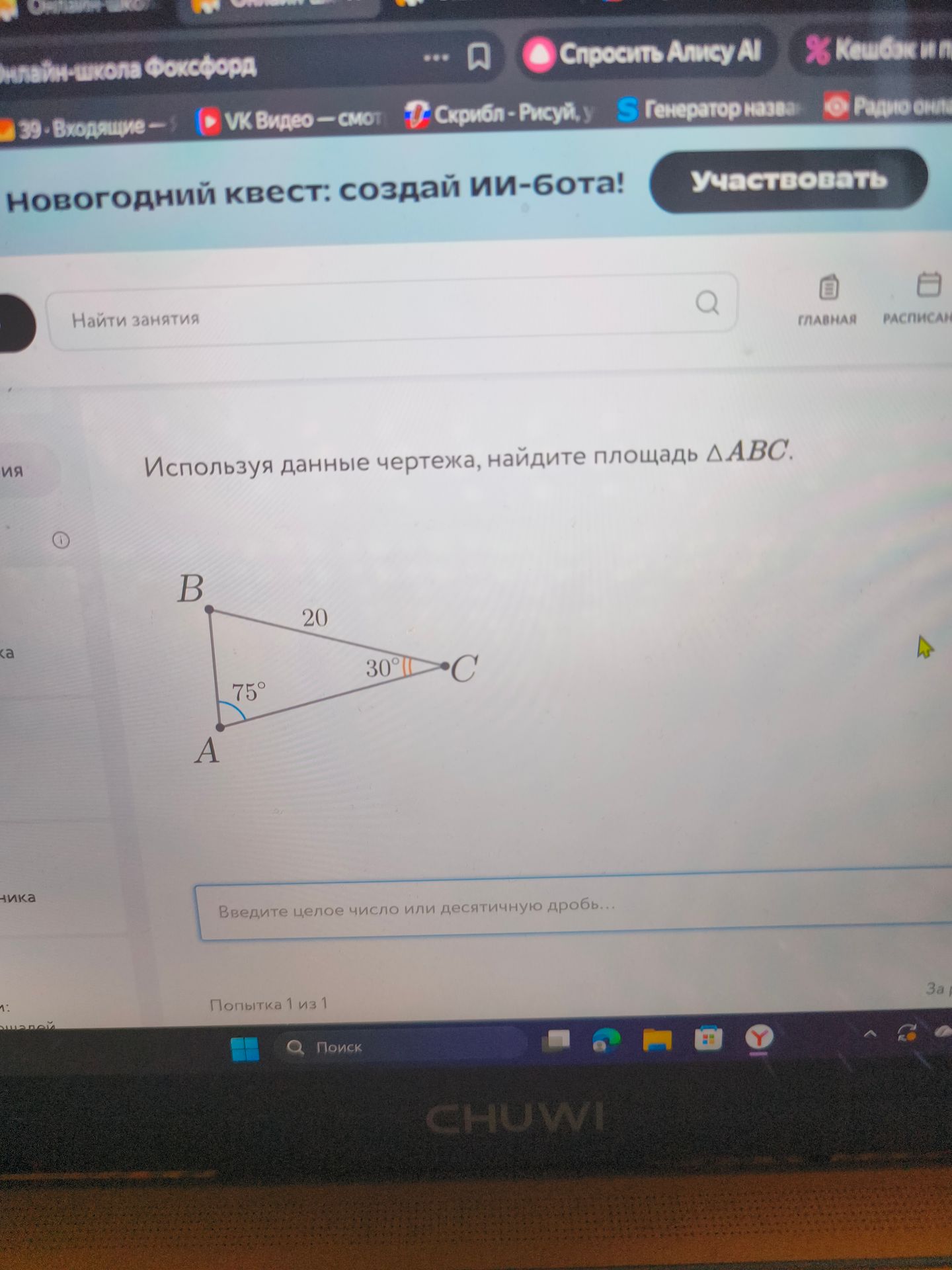 Для решения задачи необходимо найти площадь треугольника ABC, используя известные данные: сторону BC = 20 и углы \(\angle BAC = 75^\circ\) и \(\angle ACB = 30^\circ\).