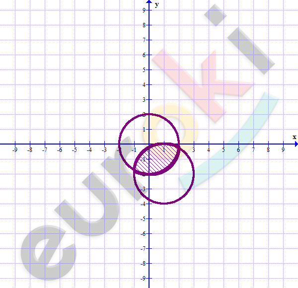 \[\left\{ \begin{matrix} x^{2} + y^{2} \leq 4\ \ \ \ \ \ \ \ \ \ \ \ \ \ \ \ \ \ \ \ \ \ \\ (x - 1)^{2} + (y + 2)^{2} \leq 4 \\ \end{matrix} \right.\ \]