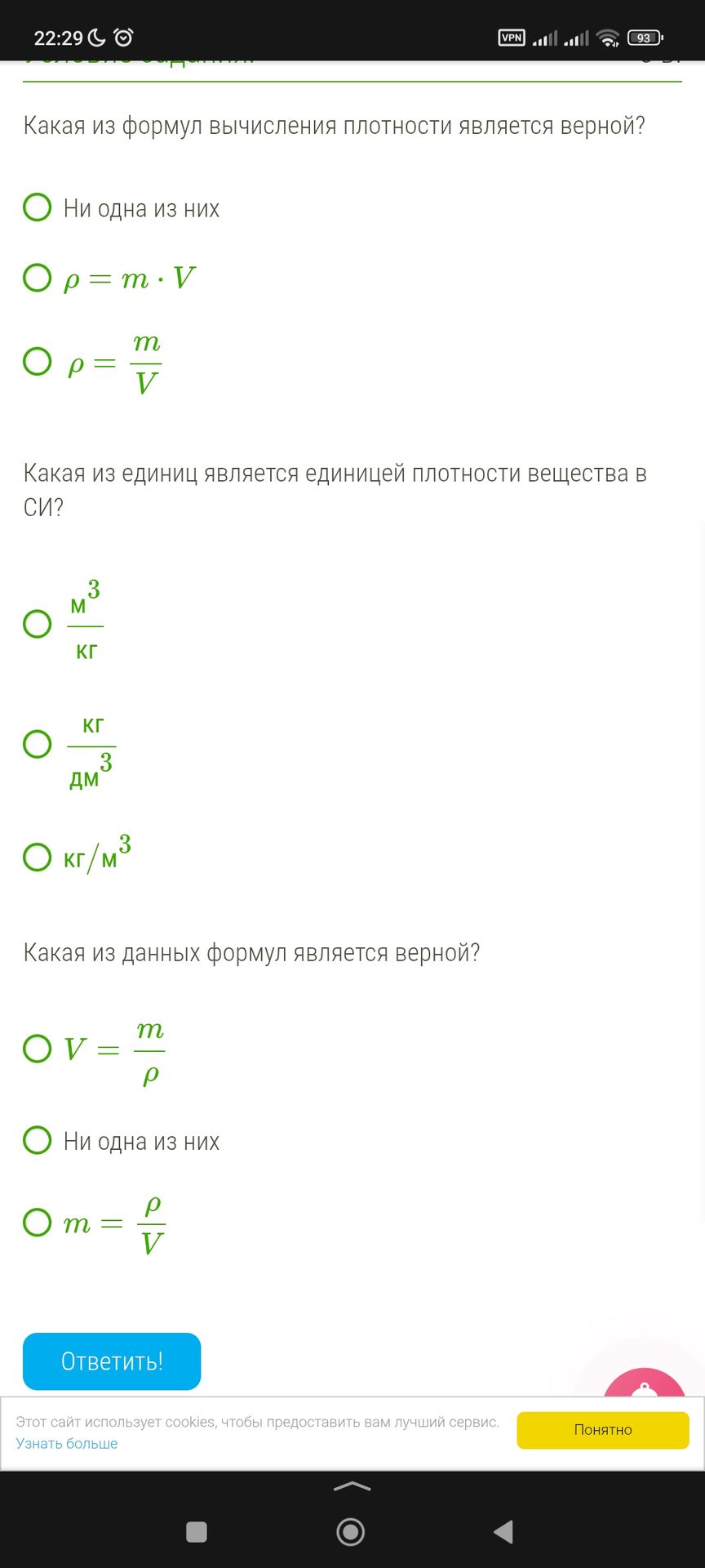 Нужно определить какая из формул верна. Плотность $$\rho$$ определяется формулой: