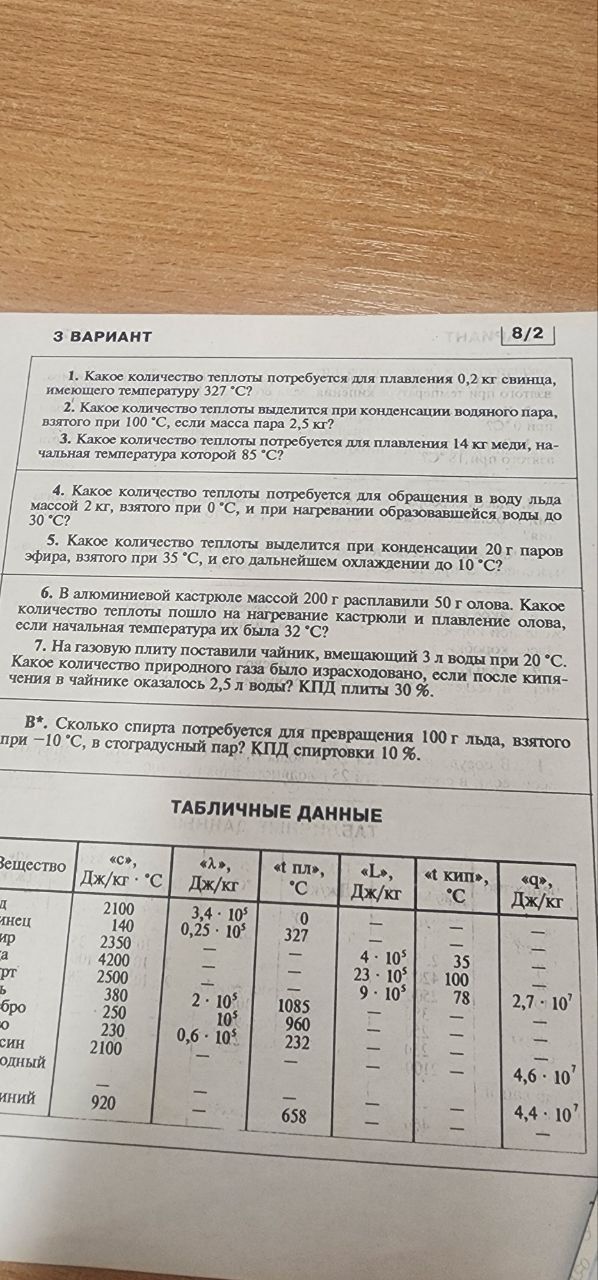 $$m = 20 \text{ г} = 0,02 \text{ кг}$$$$t_{нач} = 35 \degree\text{C}$$$$t_{кон} = 10 \degree\text{C}$$$$t_{кип} = 35 \degree\text{C}$$ (из условия)$$L = 4 \cdot 10^5 \frac{\text{Дж}}{\text{кг}}$$/code> (из табличных данных)$$c = 2350 \frac{\text{Дж}}{\text{кг} \cdot \degree\text{C}}$$/code> (из табличных данных)Количество теплоты, которое выделится при процессе, складывается из двух этапов: