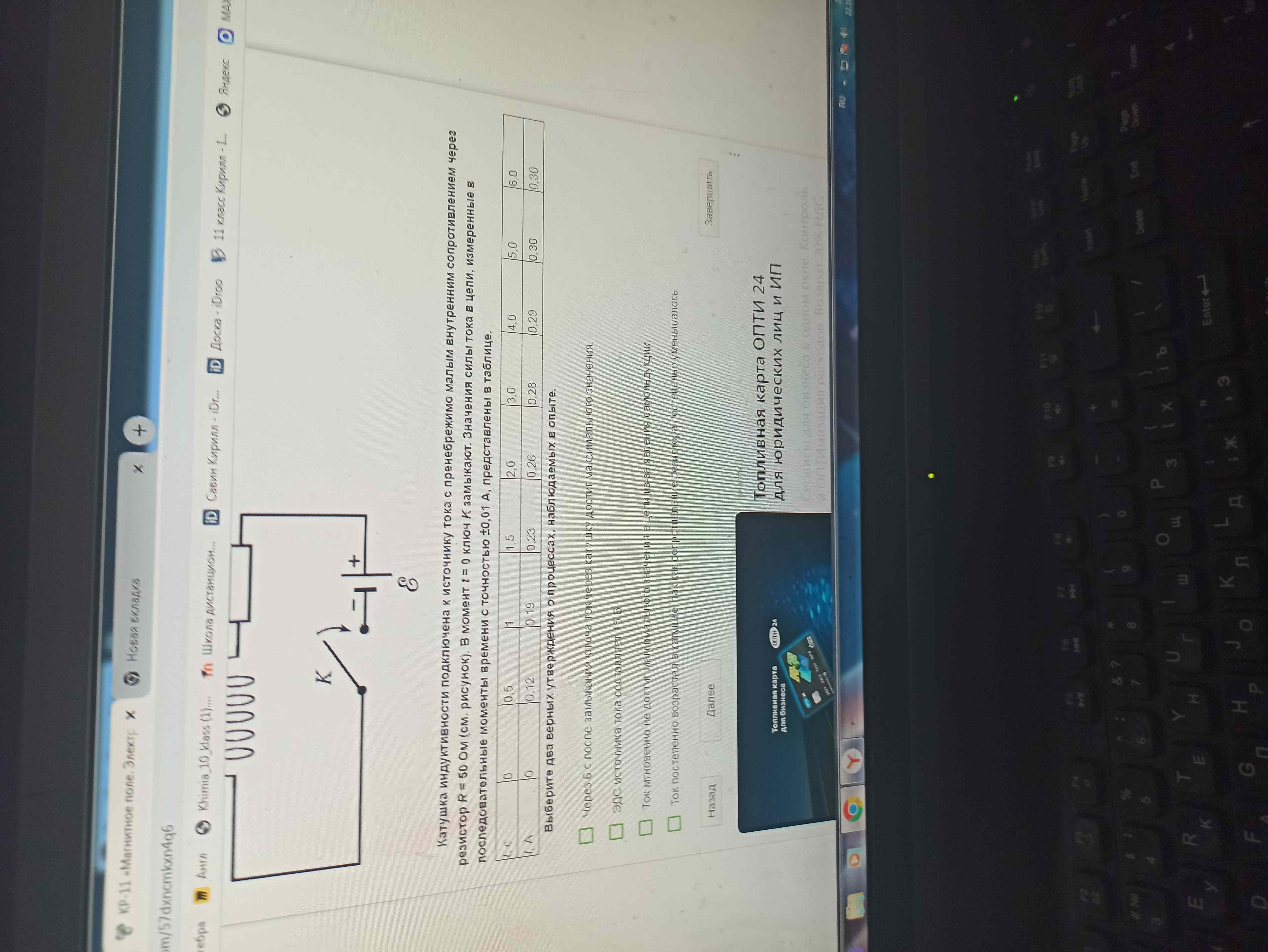 - «Ток мгновенно не достиг максимального значения в цепи из-за явления самоиндукции.» Это утверждение верно, так как при замыкании цепи с катушкой индуктивности ток нарастает не мгновенно из-за явления самоиндукции.