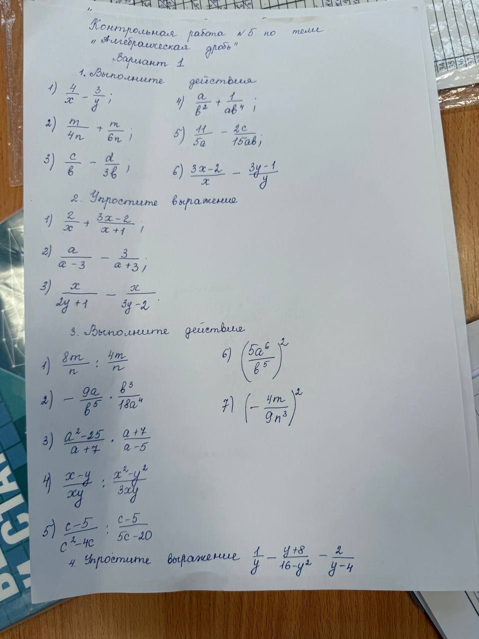 Ответ: 1) $$\frac{4y - 3x}{xy}$$; 2) $$\frac{5m}{12n}$$; 3) $$\frac{bc - 2d}{6b}$$; 4) $$\frac{ab^2 + 1}{ab^4}$$; 5) $$\frac{33b - 2c}{15ab}$$; 6) $$\frac{x - 2y}{xy}$$