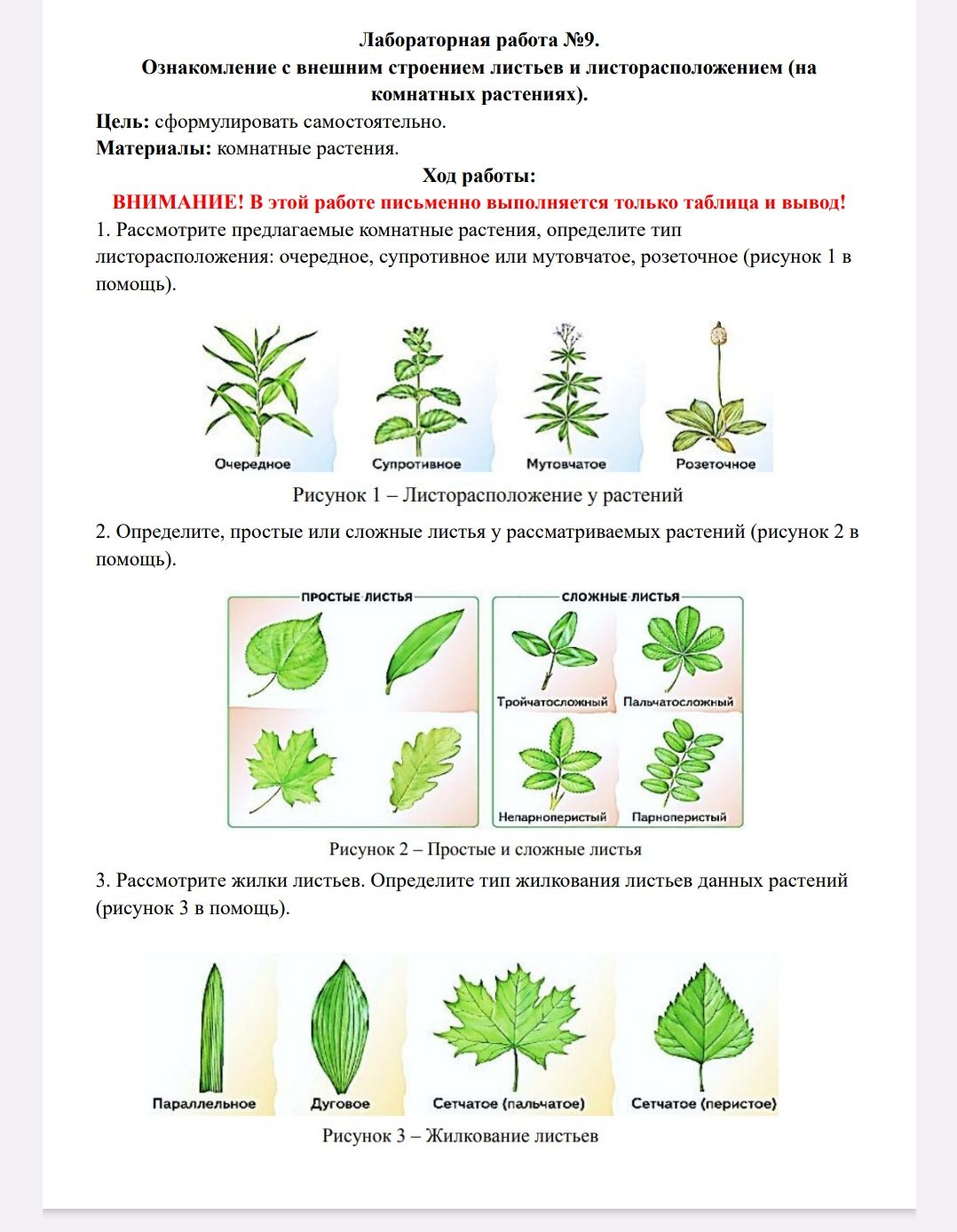 Это инструкция к лабораторной работе по ботанике, посвященной изучению строения листьев и листорасположения комнатных растений.