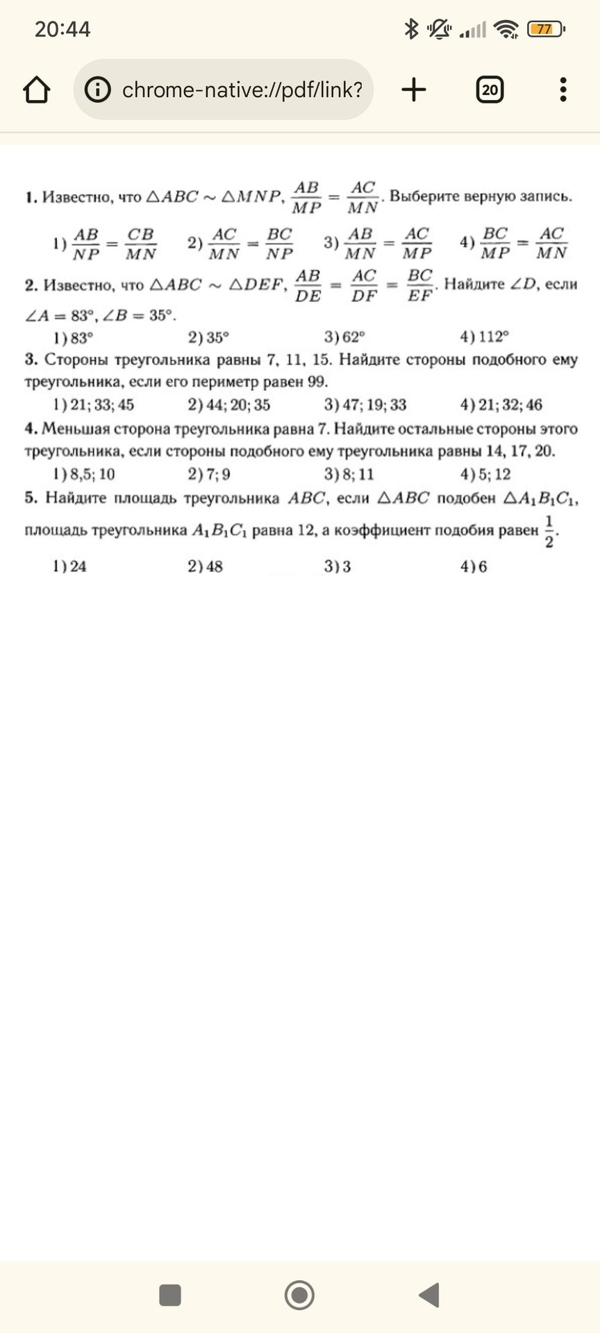 4. Меньшая сторона треугольника равна 7. Найдите остальные стороны этого треугольника, если стороны подобного ему треугольника равны 14, 17, 20.