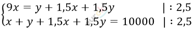 \[\left\{ \begin{matrix} 9x = y + 1,5 \cdot (x + y)\text{\ \ \ \ \ \ \ \ \ \ \ \ \ \ \ } \\ x + y + 1,5 \cdot (x + y) = 10000 \\ \end{matrix} \right.\ \text{\ \ \ \ \ }\]