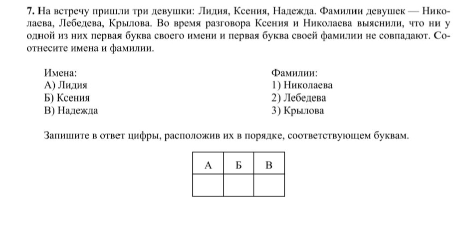 7. На встречу пришли три девушки: Лидия, Ксения, Надежда. Фамилии девушек Нико-