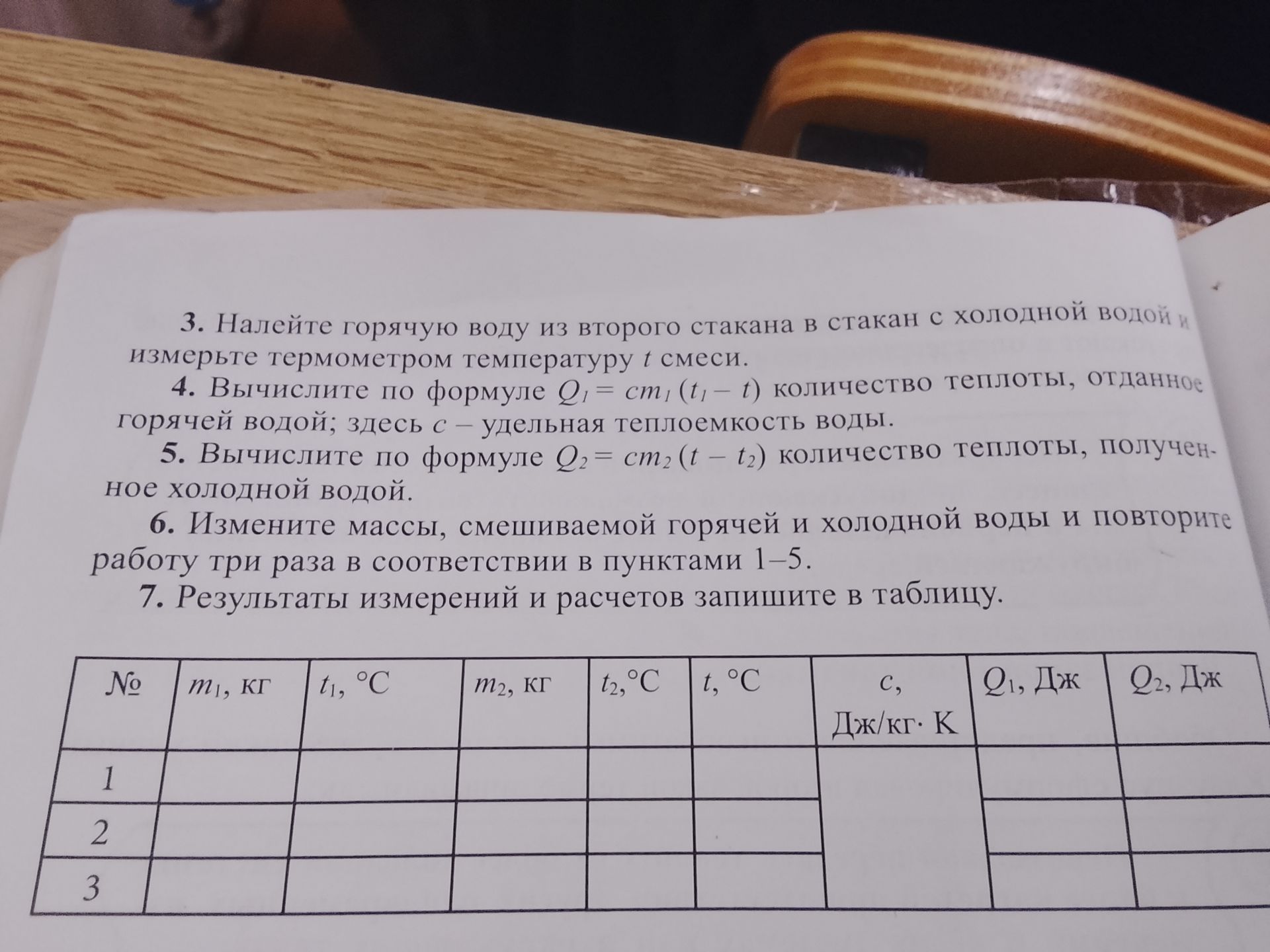 Таблица для заполнения результатов измерений и расчетов по определению количества теплоты, отданного горячей водой и полученного холодной водой.