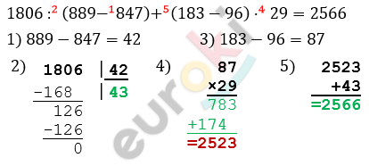 Найдите значение выражения: 1806:(889-847)+(183-96)*29.