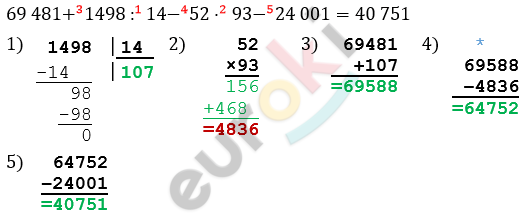 Найдите значение выражения: 69481+1498:14-52*93-24001.