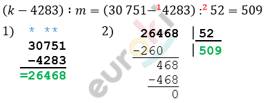Найдите значение выражения (k-4283):m, если: k=30751; m=52.