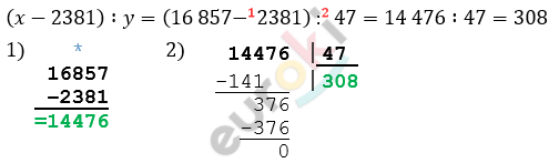 Найдите значение выражения (x-2381):y; если x=16857; y=47.