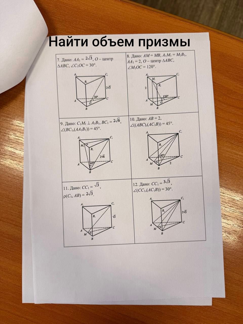 7. Дано: $$AA_1 = 2\sqrt{3}$$, O - центр $$\triangle ABC$$, $$\angle C_1OC = 30^\circ$$.