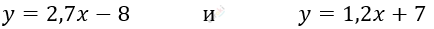 \[2,7x - 8 = 1,2x + 7\]