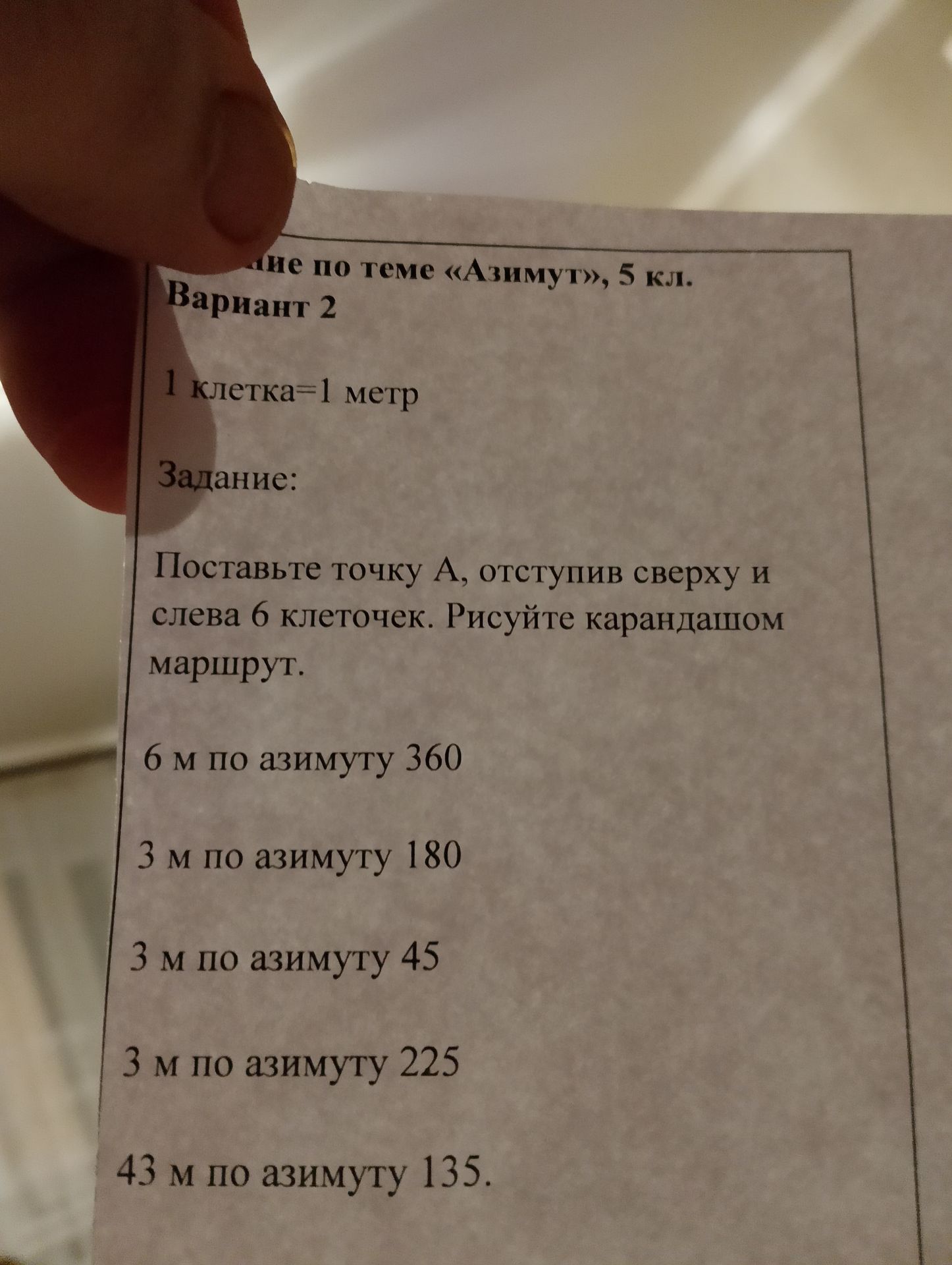 Для решения этой задачи необходимо нарисовать маршрут на клетчатой бумаге, начиная с точки А, отступив 6 клеток сверху и слева. Примем, что 1 клетка соответствует 1 метру. Маршрут рисуем карандашом, следуя указанным азимутам и расстояниям.