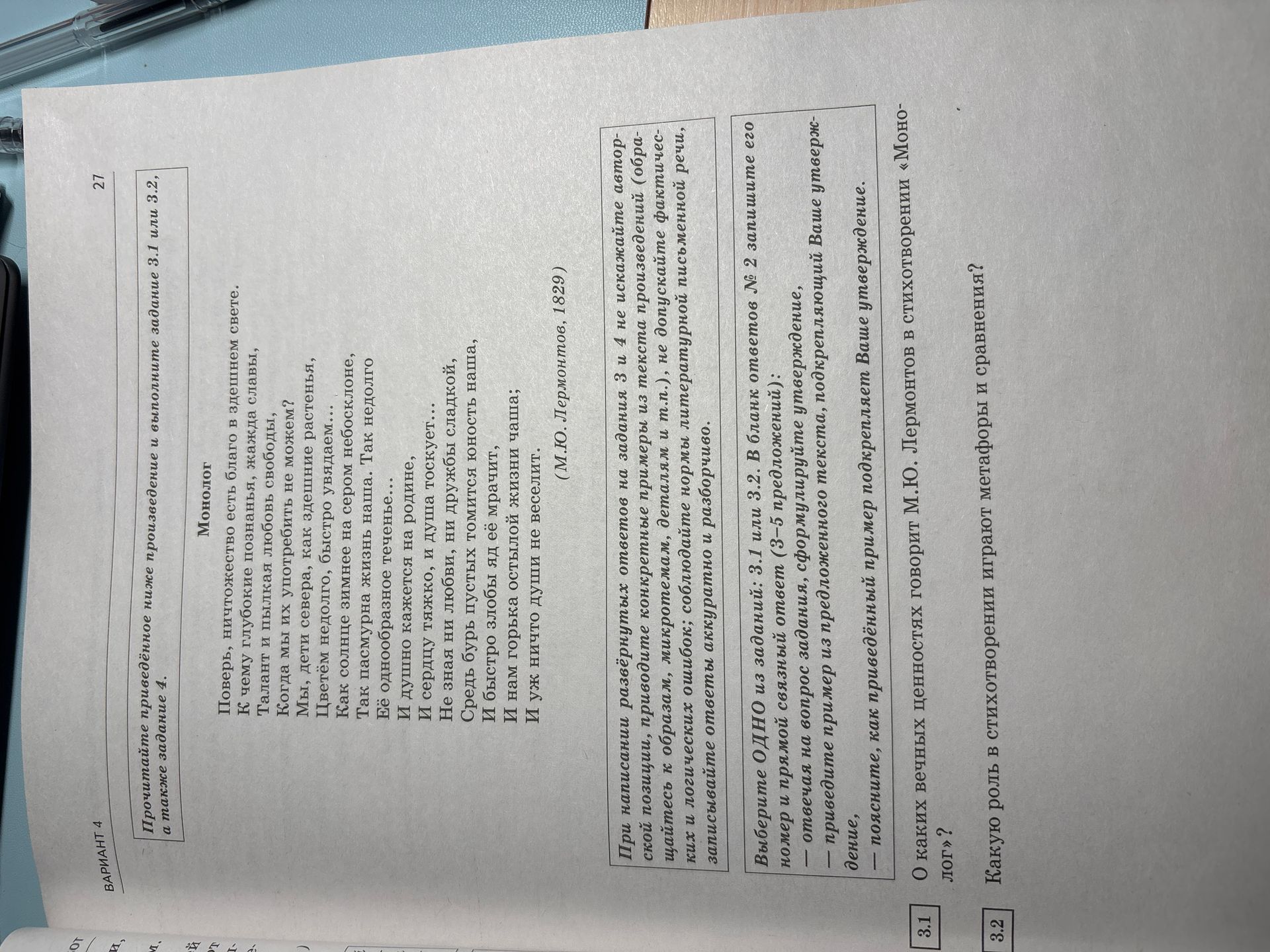 Ответ: В стихотворении М.Ю. Лермонтова «Монолог» говорится о вечных ценностях, таких как свобода, любовь, дружба, смысл жизни и счастье.