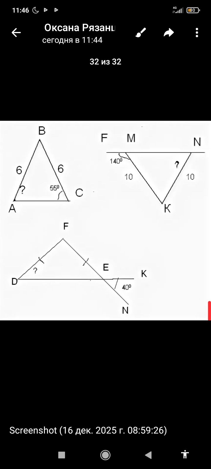 - Рассмотрим треугольник DEF. Пусть угол при вершине E равен углу KE. Угол KE и угол, равный 40°, являются смежными, следовательно, угол KE = 180° - 40° = 140°. Так как FE = DE, то треугольник DEF является равнобедренным, и углы при основании равны. Тогда угол при вершине D = углу при вершине F = (180° - 140°)/2 = 20°.