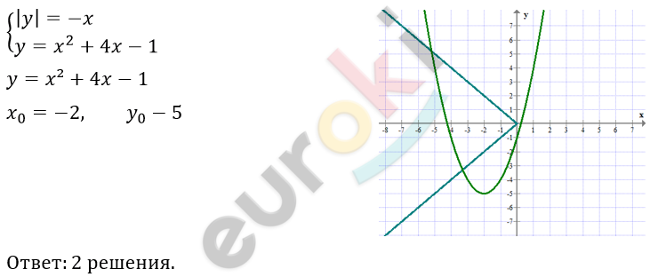 Определите графически количество решений системы уравнений: |y|=-x; y=x^2+4x-1.