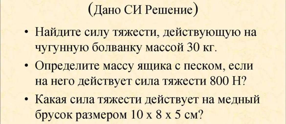 $$F = mg,$$ где:В данном случае известна сила тяжести $$F = 800 \text{ Н}$$. Необходимо найти массу $$m$$. Выразим массу из формулы: