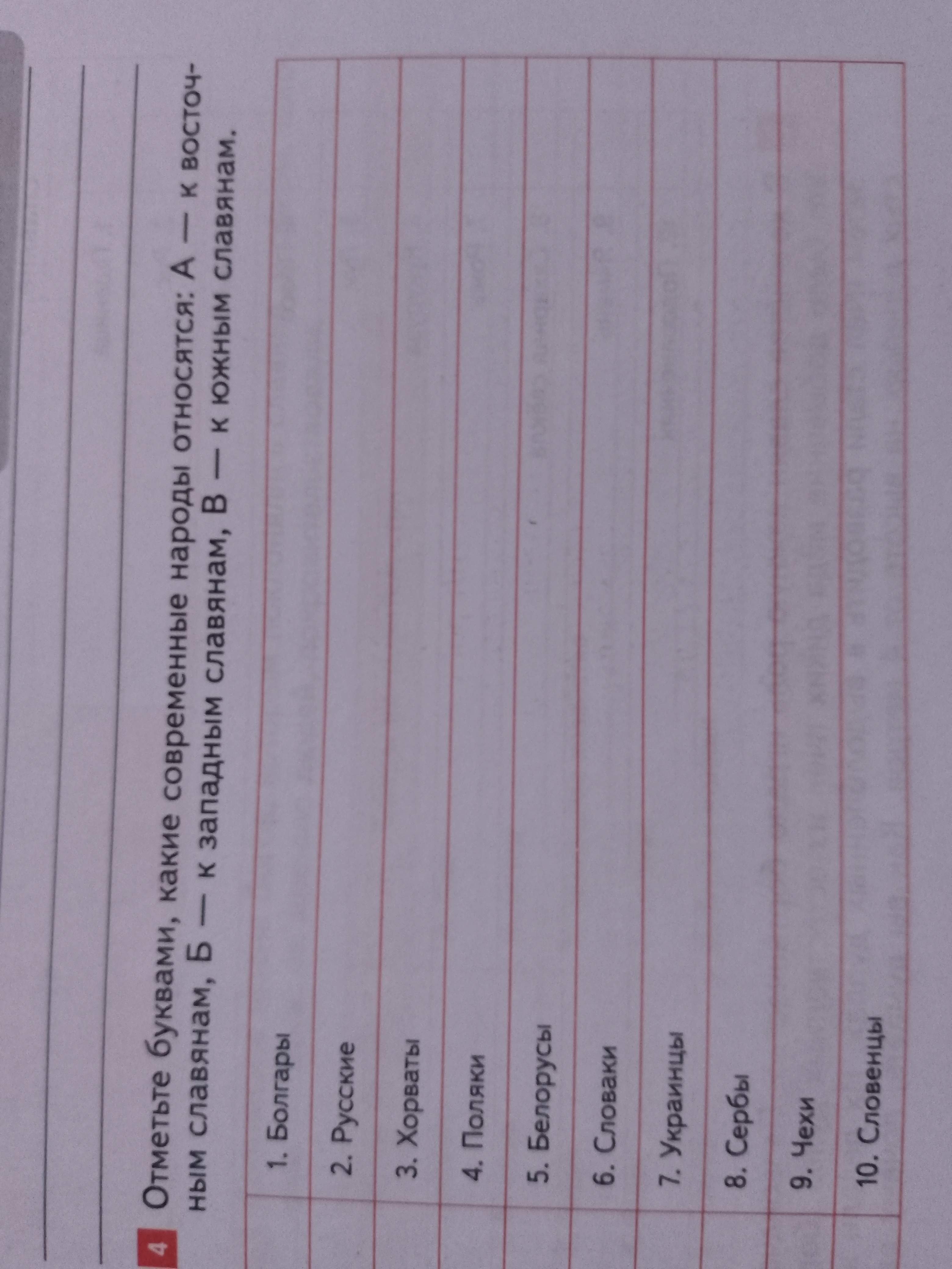 Отметьте буквами, какие современные народы относятся: А — к восточным славянам, Б — к западным славянам, В — к южным славянам.