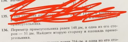 $$148 \text{ дм} : 2 = 74 \text{ дм}$$2. Найдем длину второй стороны прямоугольника: