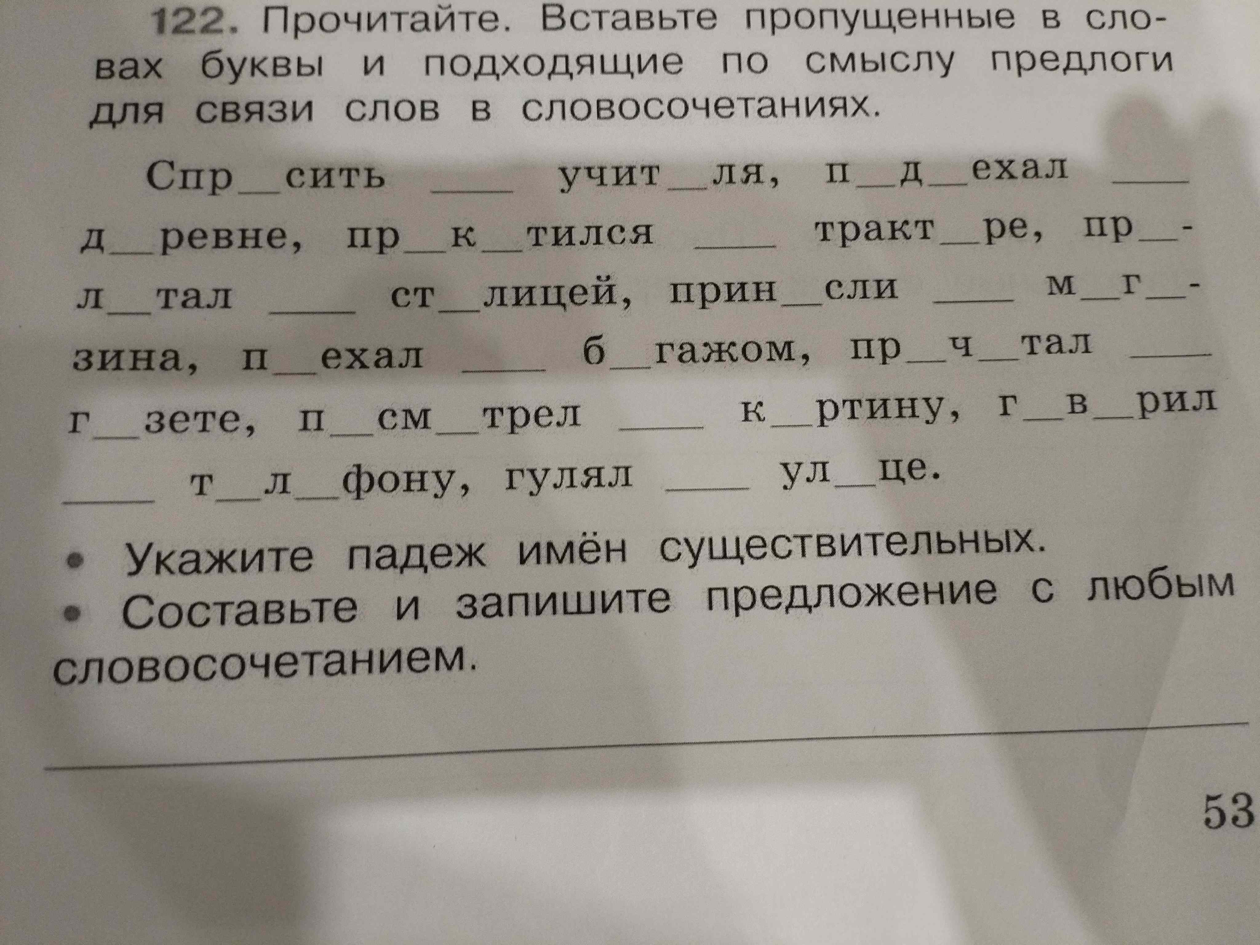 122. Прочитайте. Вставьте пропущенные в словах буквы и подходящие по смыслу предлоги для связи слов в словосочетаниях. Спр_сить учит_ля, п_д_ехал д_ревне, пр_к_тился тракт_ре, пр_- л_тал ст_лицей, прин_сли _м_г- л_тал б_гажом, пр_ч_тал г_зете, п_см_трел _к_ртину, г_в_рил _т_л_фону, гулял _ул_це. * Укажите падеж имён существительных. * Составьте и запишите предложение с любым словосочетанием.